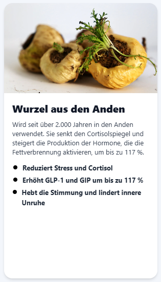 Es wurde speziell für Frauen mit trägem Stoffwechsel entwickelt, insbesondere ab 35 Jahren, die ihre GLP-1- und GIP-Hormone auf natürliche Weise reaktivieren wollen. Diese sind entscheidend für die Fettverbrennung und die Appetitkontrolle.